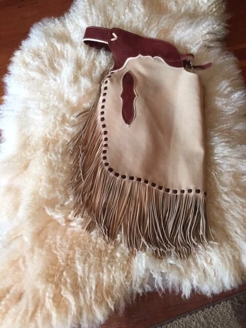 10 top grain 3 1/2 ounce leather 7 inch fringe laced around the bottom featuring cream underlay on the leg and belt.